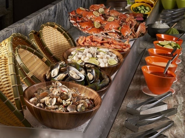 「鮮美時令海鮮區」則是選用當季現流螃蟹、甜白蝦、淡海鮮貽貝、多款生魚片、散壽司及茶蕎麥冷麵等。「甜點飲料區」入廳即見多達15款以上精選甜品以及莫凡彼冰淇淋任選,平日週一至週五午餐每位880+10%元、晚餐每位980+10%元,假日午晚餐每位1080+10%元。
