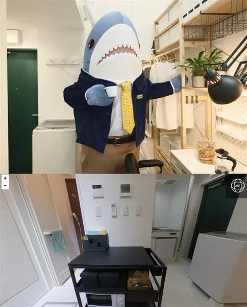 日本IKEA「迷你家」專案主角鯊魚玩偶化身仲介,向人們介紹新推出月租不到台幣30塊的套房。(圖/日本IKEA官網)