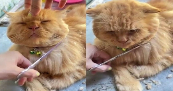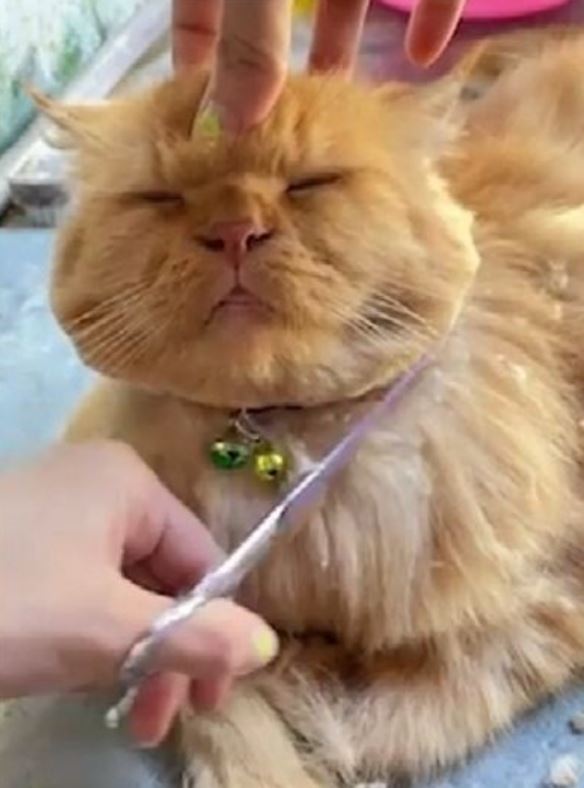 泰國達叻府一位網友分享一段影片,可以看到一隻貓咪莫莫,正乖乖地坐著修剪毛,而她一手摸著莫莫的頭,另一手則拿剪刀修剪下巴的毛,整個過程中,莫莫不但沒有反抗,或是有任何害怕、生氣的表情,只是坐著露出滿意的神情,看起來很享受,甚至快開始瞌睡。