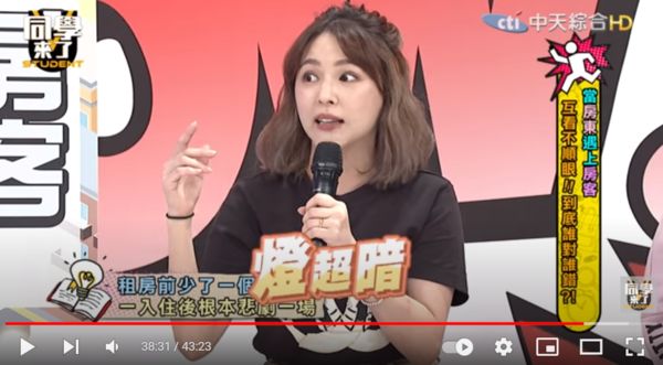 熊熊最近上《同學來了》表示包括她在內,大多數人都是在白天看房子,卻因此忽略室內的燈光問題,也無法觀察其他房客下班後的情景,還疏忽「驗熱水」的步驟,結果一搬進去就發現燈超暗、還「很像鬼屋」一直閃爍,洗澡時竟然只有冷水。