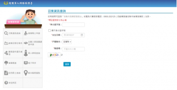 民眾進到「後備軍人網路服務台」網站後可選「使用個人資料登入」,輸入身分證字號、出生日期、戶籍縣市查詢,或「使用我的E政府登入」查詢。