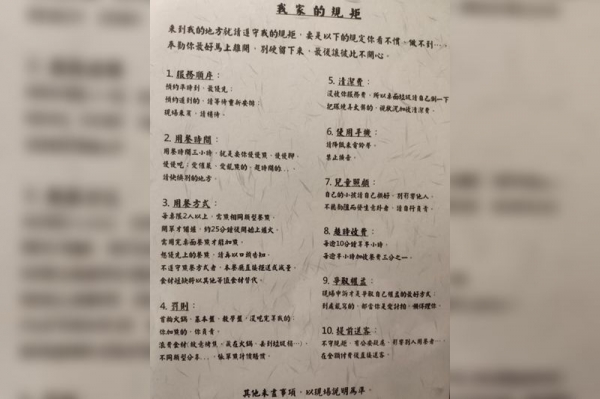 這名女子在PTT上分享,近期群組在討論尾牙地點,最後決定吃某間燒肉店,她看了網路評價後,發現風評還不錯,直到看到一張名為「我家的規矩」的注意事項。