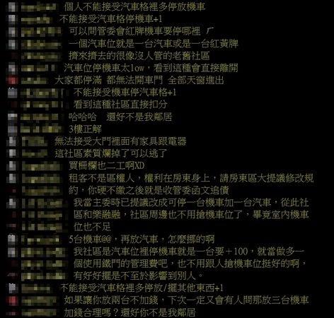 然而留言串中,多數網友都直言,無法接受車格同時有汽車和機車,「個人不能接受汽車格裡多停放機車」、「一個汽車位就是一台汽車或是一台紅黃牌,擠來擠去的,很像沒人管的老舊社區」、「汽車位停機車太low,看到這種會直接離開」、「大家都停滿,都無法開車門,全部天窗進出」、「無法接受大門裡面有家具跟電器」。