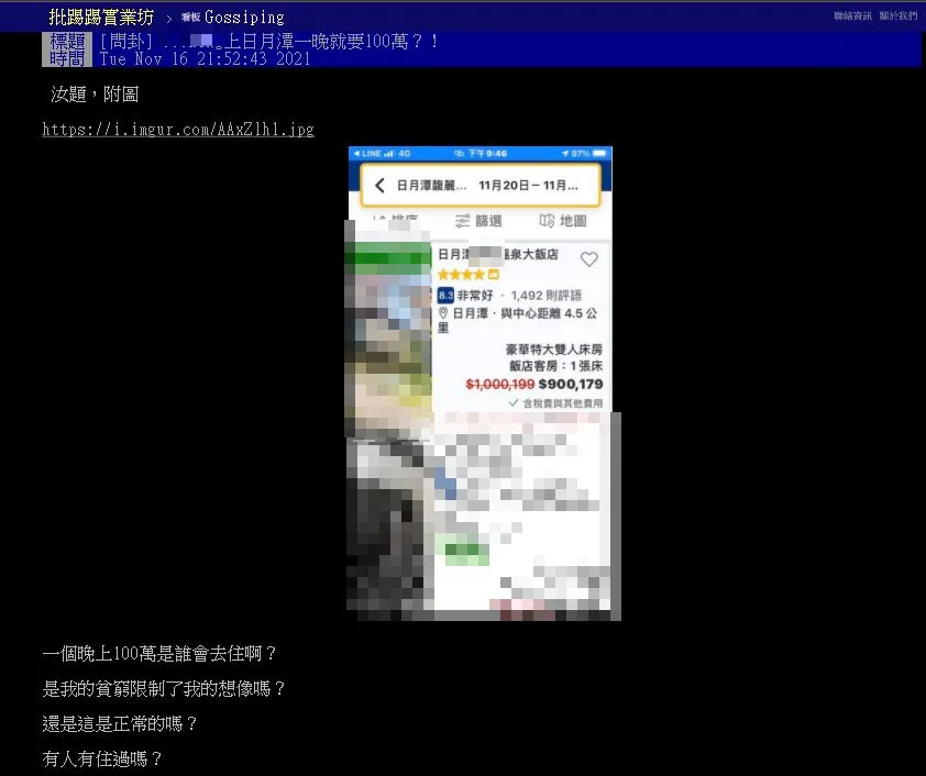 一名網友16日在PTT Gossiping版貼文,驚呼這實在太貴,房間數還僅剩一間,內文提到「一個晚上100萬是誰會去住啊?是我的貧窮限制了我的想像嗎?還是這是正常的嗎?」引發網友熱烈討論。