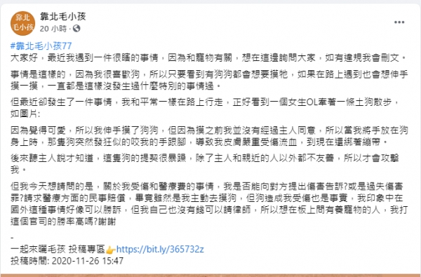 因為覺得可愛,所以我伸手摸了狗狗,但因為摸之前我並沒有經過主人同意,所以當我將手放在狗身上時,那隻狗突然發狂似的咬我的手跟腳,導致我皮膚嚴重受傷流血,到現在還綁著繃帶。