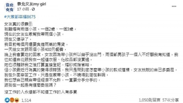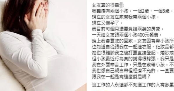 一名男子在臉書「靠北女友」匿名發文表示,目前和女友同居中,他過去曾有段失敗的婚姻,和前妻生下了2個現年2歲及3歲的兒子,女友就在家專職帶兩個小孩,交往過程女方相當體諒他,衣服跟化妝品都沒買過,也幾乎足不出戶,更表示願意登記結婚就好,省下婚紗和戒指等花費;如今女友也懷孕,他一個人養全家還要負擔,讓他覺得很有壓力。