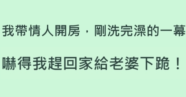 那晚像往常一樣我和她住進了一家高級汽旅,然後我就去洗澡了,等我洗完出門,卻看到她在玩我的手機,我立馬搶過去一看我整個人都呆了,她竟然拿著我的手機在和我老婆說話,還拍了幾張我放在床上衣服的照片傳了過去,勸我老婆離婚。