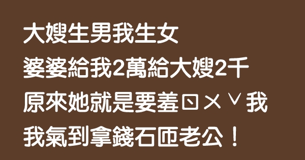 想看更多好文,或是喜歡有錢人這麼想的文章的話,可以按讚追蹤遇見幸福並分享這篇大嫂生男我生女,婆婆給我2萬給大嫂2千,原來她的意思就是要狠狠羞ㄖㄨˇ我!我氣到拿錢石匝老公了!出去給大家一起看看喔!