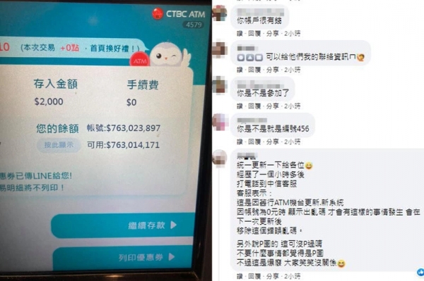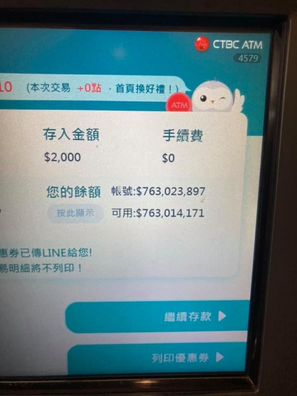 該名網友在《爆廢公社》發文,表示自己月薪只有18K,最近去存錢時用ATM要存入2000元,沒想到跳出餘額竟達7億6301萬4171元,樂得以為自己賺到了!網友看了也紛紛驚訝回應:「這截圖要好好保存下來,因為你永遠不會在螢幕上看到了!」、「看到這些數字也會爽一下!」、「請問這台ATM在哪?想讓自己帳戶也出現這種數字!」、「有缺乾兒子嗎?」