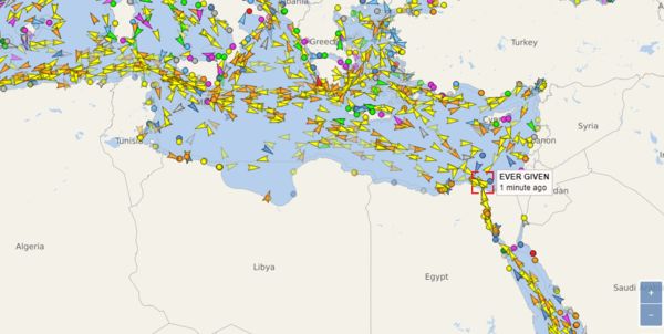 實際查詢船運軌跡網站 VesselFinder,長賜號的位置已經進入地中海,所以在幾個小時前,的確正在通過蘇伊士運河,並且已經順利通過。