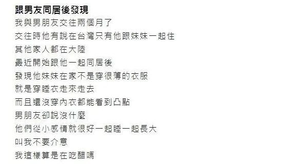情侶交往一段時間後,常發展為同居生活,不過如果是和對方的家人同住,不免會發生摩擦。一名女子表示,男友的妹妹在家都不穿內衣,容易看到凸出的.乳..頭,「我這樣算是在吃醋嗎?」