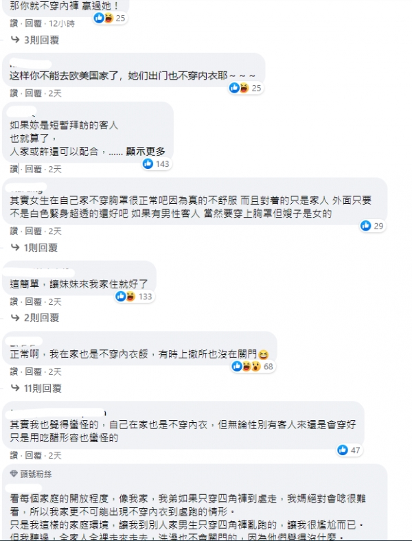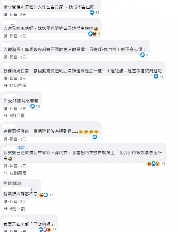 文章曝光後引起網友熱議,不少人認為男友妹待在自己家,當然會以舒適為主,紛紛表示「每個人都有自己覺得舒適的居家服,別太在意了」、「從小看到大早就膩了好嗎」、「在家當然穿舒適點」,不過也有人說,「妳算是外人,有妳在時她應該穿比較完整一點」。