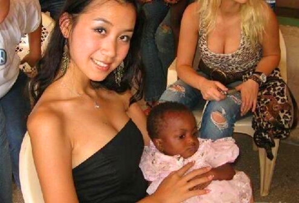 而中非戀情生下來的小孩膚色,大多數是隨黑人父親的黑色肌膚,隨母親的很少見。圖為女孩抱著她與黑人丈夫的小孩,小孩膚色黝黑,像極了父親。
