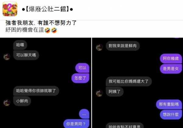 該名網友在臉書社團「爆廢公社二館」貼出幾張對話截圖,並表示「強者我朋友,有誰不想努力了?」