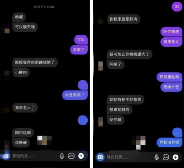 從照片中可以看到,阿姨突然私訊原PO朋友,並直接表明意圖 「覺得你很帥就聊了,小鮮肉」、「哈哈有點不好意思,想來找鮮肉,給你錢」。