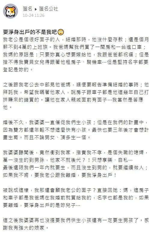 在結婚後,她的老公因為愛面子,因此向她要求,瞞著他(男方)家人,房子跟車子都對外說,是靠他這幾年打拼賺錢買的,結果讓婆家對此深信不疑,認為房子車子真的是兒子買來的,因此婆婆的態度一直都相當不客氣,在婚後不停催促他們生小孩,