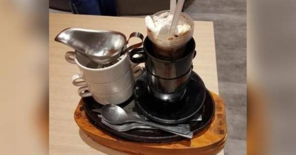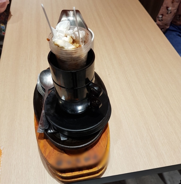 ▼從照片中可以看到,桌面非常乾淨,餐具被層層高疊,最底下放著牛排鐵盤和木盤,黑色瓷盤、醬料容器、馬克杯、湯匙堆疊著,最上面是塑膠杯,裡面塞著用過的衛生紙。這一桌客人將餐盤擦得非常乾淨,一點也不像剛用餐完的樣子。