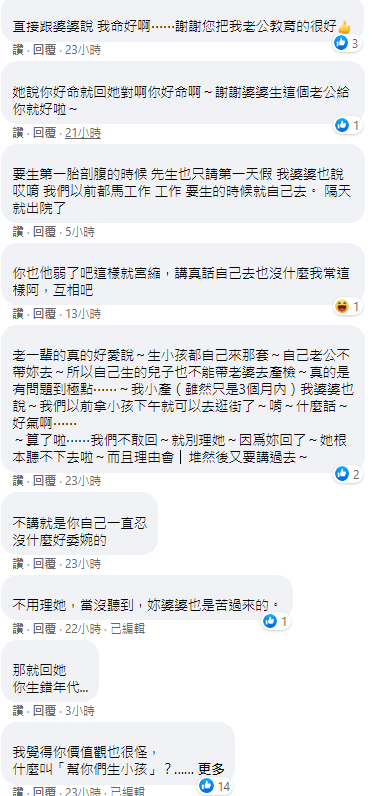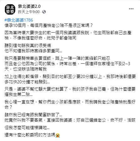 我心裡一直在想,幫你們生小孩都是應該,而我請我老公陪產檢就是好命?