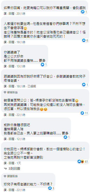 婆婆就跟她說「我生兩胎都自己去產檢,不像妳這麼好命,我兒子都會陪同」