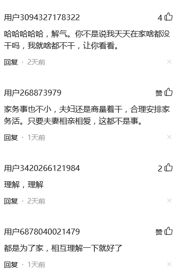 對此,網友們卻紛紛稱讚妻子的做法解氣:「哈哈哈哈哈,解氣。你不是說我天天在家啥都沒幹嗎,我就啥都不幹,讓你看看。」「家務事也不小,夫婦還是商量著干,合理安排家務活。只要夫妻相親相愛,這都不是事。」「都是為了家,相互理解一下就好了」