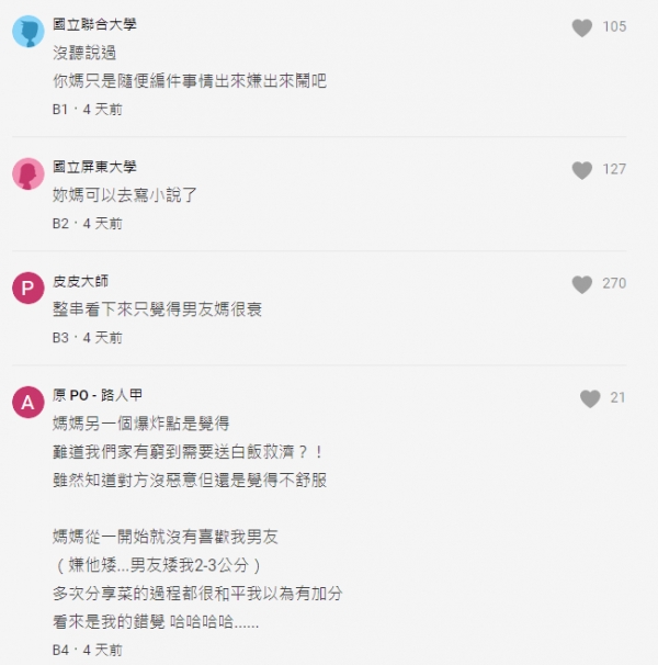 此外也有網友認為應該是有弦外之音,直言「我是覺得,其實是你媽不喜歡你男友」、「心裡如果不滿意對方,一點小事都會變成大事」,認為原PO最好再和媽媽好好聊一聊。