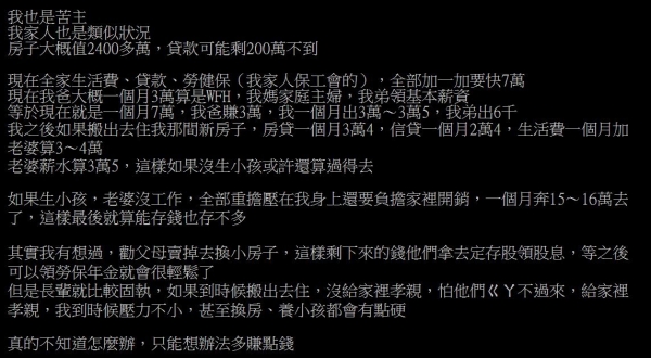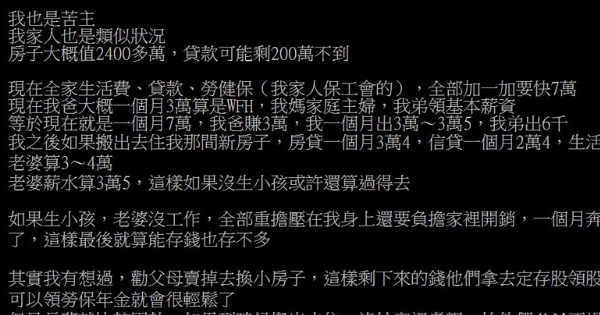 對此,一名擔任醫師的網友回文分享類似窘境,家裡房子市值2400多萬,住著一家四口,每月開銷快要7萬元,其中老爸出3萬、原PO出3萬5000元,弟弟則付6000元左右,龐大負擔還算勉強過得去。