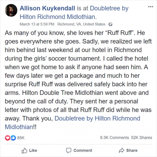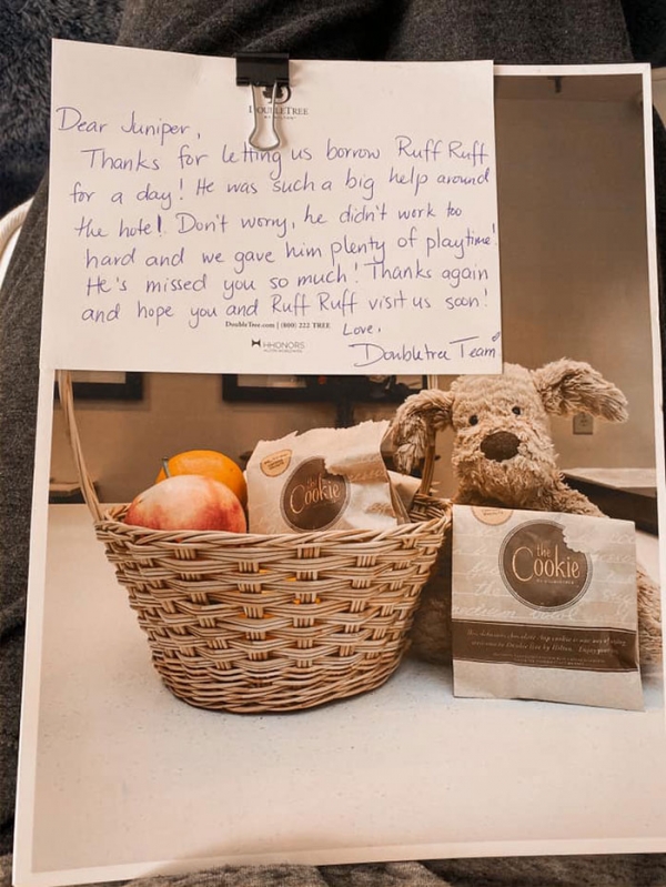 根據外媒washingtonpost報導,事情發生於去年,有位名叫朱尼珀 (Juniper) 的小女孩跟著爸爸媽媽外出旅遊度假時,不小心把自己最珍貴的狗娃娃好朋友「汪汪」(Ruff Ruff) 留在飯店忘了帶回家,因此便趕緊請媽媽打電話到飯店詢問,深怕自己再也無法與「汪汪」重逢...