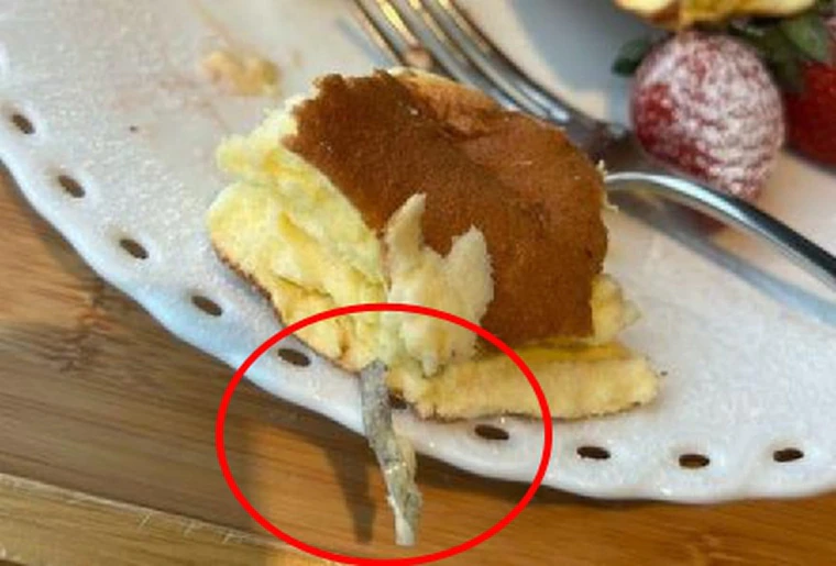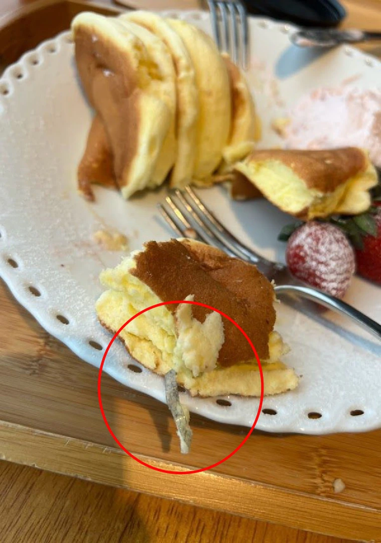一名孕婦在台中三井ROSE HOUSE Café,在舒芙蕾鬆餅中吃到一條「黏了好多毛的膠帶」(紅圈)。