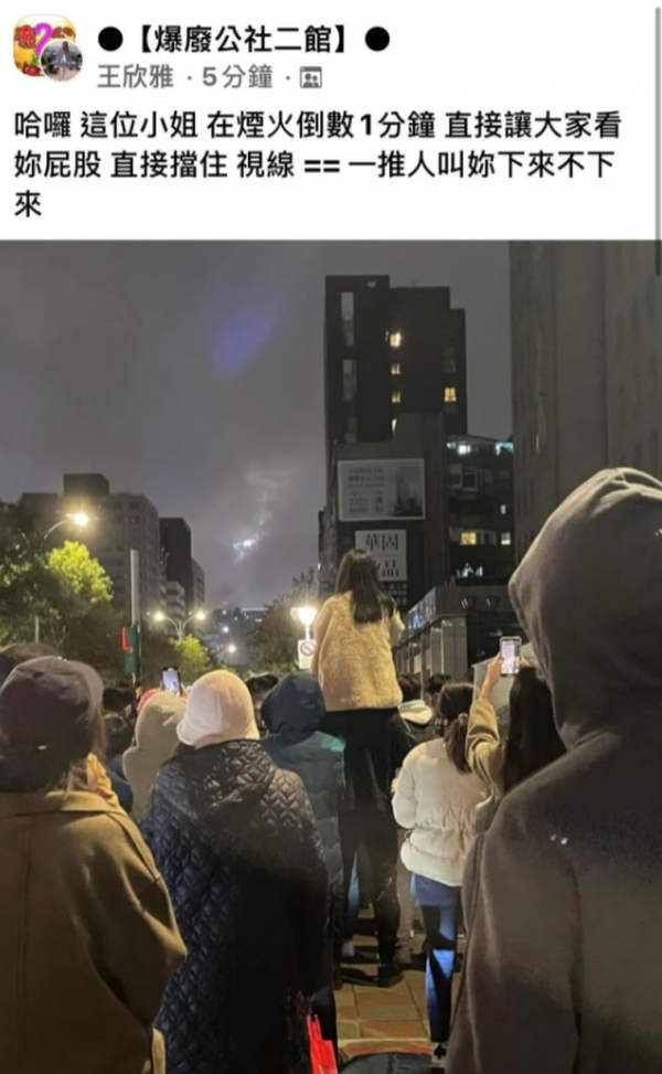 網友在《爆廢公社二館》po文說,當大家在等跨年煙火時,前方一對情侶「哈囉,這位小姐,在煙火倒數1分鐘,直接讓大家看妳屁股、直接擋住視線 ,一推人叫妳下來、不下來!」從發文附上照片顯示,看起來是一對情侶,女方坐在男生的肩上「鶴立雞群」。