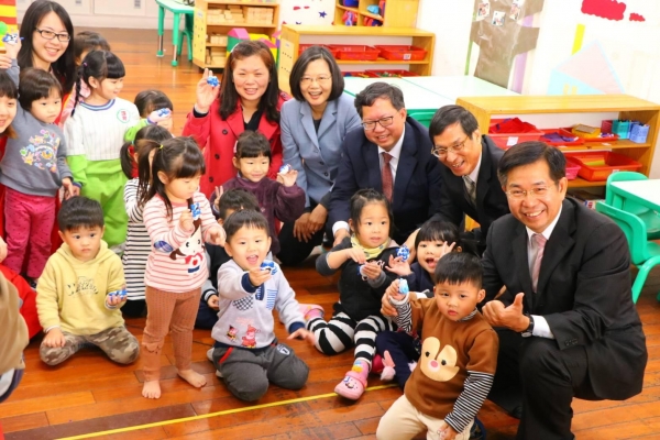蔡英文說,公共化幼兒園3000班的目標,明年會提前達標,去年所有提供公共化、非營利和準公共化幼兒園的園所數,已經大幅成長。過去家長反映抽到公立幼兒園的機會只有3成,現在已經提高到6成,可以進入平價優質的幼兒園,「0到6歲國家跟你一起養」,說到就一定做到。