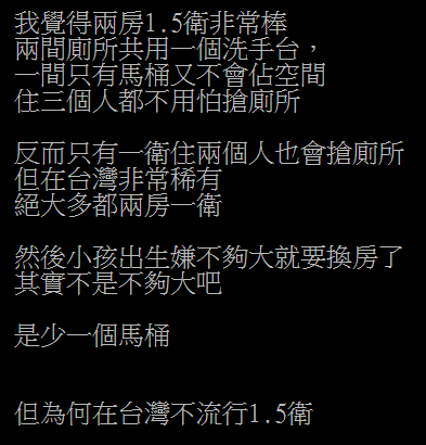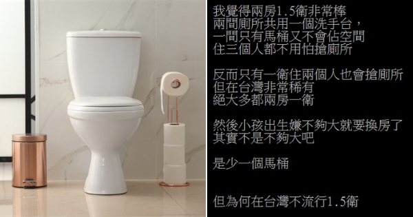 原PO在PTT表示,他覺得1.5衛是最適合小坪數的設計,兩間廁所共用一個洗手台,「一間只有馬桶又不會佔空間,住三個人都不用怕搶廁所」,也不怕遇到馬桶堵塞等狀況,反觀一個馬桶的設計相當不方便,即便只有住一對夫妻也可能有搶廁所情形,不過,目前在台灣要找到兩房兩衛或是1.5衛的建案很困難,大多都兩房一衛,「為何在台灣不流行1.5衛?」