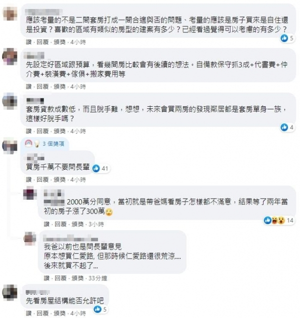 留言串中,一票過來人則中肯建議,「買房千萬不要問長輩」、「我學風水的,不建議這樣做」、「這是什麼提議?以後媽媽的話少聽」、「媽媽的意見參考就,還是要參考專業人士」、「我爸以前也是問長輩意見,原本想買仁愛路,但那時候仁愛路還很荒涼,後來就買不起了」、「要不要打通,首先考慮未來脫手時,至少被砍4成」。