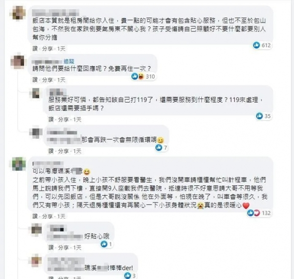 此外,部分網友則幫原po緩頰,表示飯店有意識到救護車到場,「是應該要關心一下,完全不聞不問確實給人感受不太好。」還有人推薦自己在其他家飯店入住的經驗,指出當時也是帶小孩入住,而小孩身體不舒服要看醫生,本來只是想請櫃台幫忙叫計程車,沒想到他們竟直接開一台九人座載他們到醫院,甚至還在外面等他們看診完,隔天還關心了一下孩子的狀況,讓他們直呼好暖心!