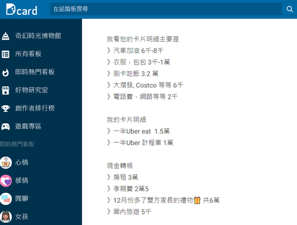 原PO也附上消費明細,其中包括每月花在汽車油錢6至8千、衣服包包3千至1萬、餐費3.2萬、賣場消費6千、電話及網費2千,另外還有美食外送平台1.5萬、搭計程車花1萬,加上房租3萬、孝親費2.5萬,還有12月份給雙方家長的禮物6萬及國內旅遊5千等。