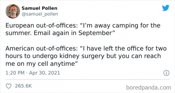 2. 歐洲上班族不在辦公室時:「我夏天要去露營喔,請9月再來信。」 美國上班族不在辦公室時:「因為要動腎臟手術,我必須請假2小時,但你還是可以隨時打我手機。」