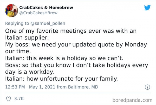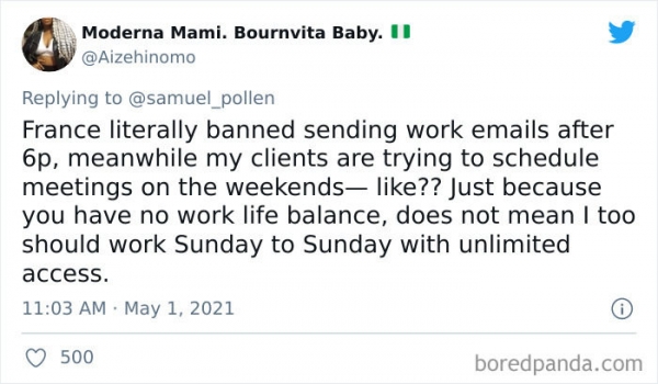11.「法國是直接禁止傍晚6點後寄工作相關的email,結果我的客戶們還在想要怎麼把會議排在週末,我心想啥小啊??你的工作與生活之間不平衡,不代表我也要無限上綱地配合你禮拜天工作啊。」