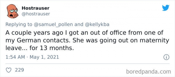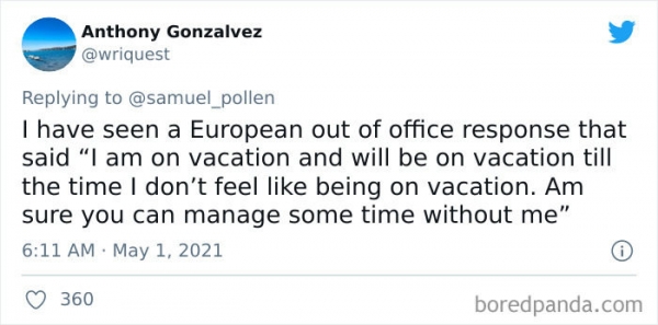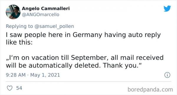 17.「我在德國這遇到的人,都會設定這樣的自動回覆訊息:『我休假到9月,收到的所有email都會被自動刪除,謝謝。』」