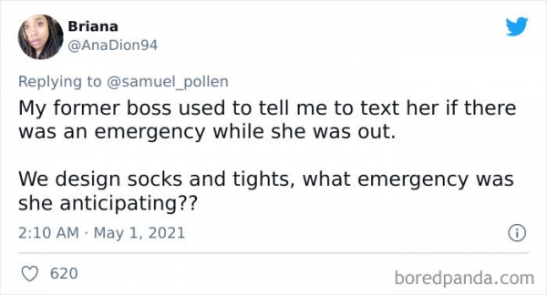 16.「我前老闆以前不在時都說有急事傳訊息給她。我們是設計襪子跟褲襪的耶,她到底是在期望會有什麼急事?」