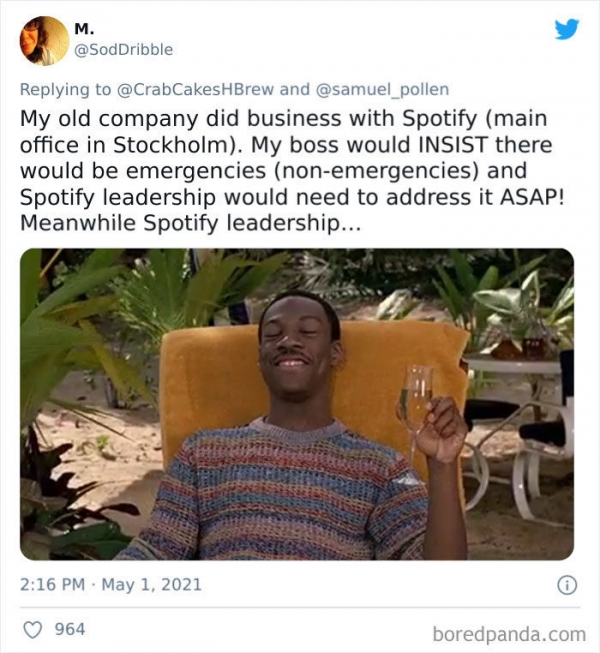 20.「我待過的一間公司跟Spotify (總辦公室在斯德哥爾摩) 有合作。我當時老闆總是堅決表示一定會有緊急狀況 (但實際上都是非緊急狀況),要求Spotify領導階層必須立刻回應!這時的Spotify領導階層:」