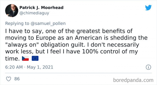 9.「必須說,身為美國人的我搬來歐洲後最大的好處,就是擺脫『無法全天候待命』的罪惡感。我的工時不見得少很多,但我終於覺得對自己有100%的時間管理權。」