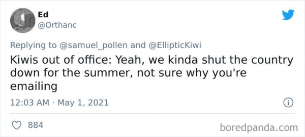 12. 紐西蘭人休假時:「對耶,我們等於是整個夏天全國都在停擺狀態,不曉得你為何還要email我們。」