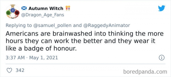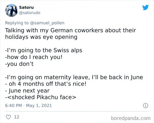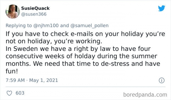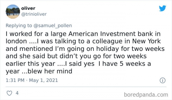 10.「我曾在倫敦當地一間美國銀行工作,有次跟紐約那裡的工作夥伴聊到,我接下來有兩個禮拜的假,她說可是你今年稍早不是已經放過兩個禮拜的假了嗎,我說對,但我今年還有5個禮拜的假可以放…她完全無法想像」