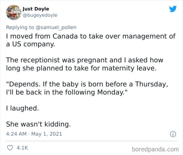 3.「我搬離加拿大去接管了一間美國公司,櫃台接待懷孕了,我問她打算放多久的產假,她說:『要看情況耶,如果寶寶出生是在禮拜四前,那我隔週禮拜一就會回來。』我笑了。她沒在開玩笑。」