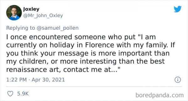 7.「我曾遇過一個人,他狀態寫說『我目前跟家人在佛羅倫斯度假,如果你認為你的訊息比我的孩子重要,或者比那些文藝復興時期藝術品還有趣,那麼請照下列方式聯絡我』」