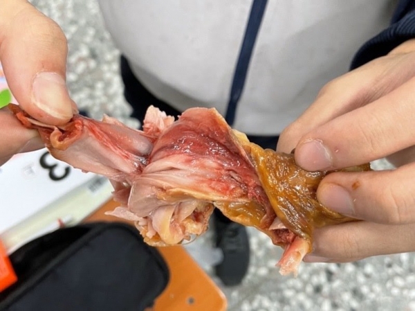 1000隻由自設廚房的黎明國小處理,其餘1500隻則是廠商的中央廚房,不過悶烤時間不足,造成部分烤雞腿骨肉呈血色。