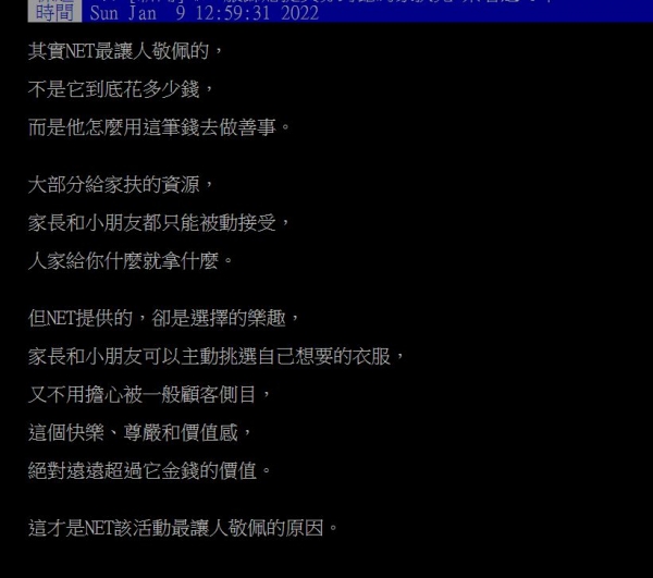 近13年來,業者的低調行善成為美談,就有鄉民在PTT直言,「NET最讓人敬佩的,不是他們到底花多少錢,而是怎麼用這筆錢去做善事。」