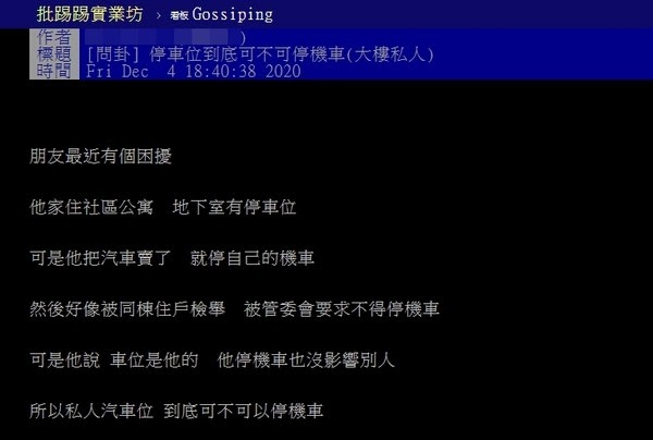 購屋、搬進社區前,最好了解一下相關的法令,以免發生糾紛。最近一名網友就在PTT八卦板上分享了一件事,朋友住在某社區公寓,地下室有自己的車位。後來他將汽車賣掉,將機車停進去,沒想到竟被同棟住戶檢舉,管委會也要求他不能停機車。這讓他很費解,車位是自己買的,停機車也沒有影響到別人,為什麼會被檢舉呢?