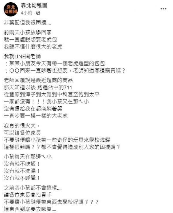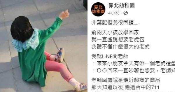 今(11)日一名媽媽透過臉書《靠北幼稚園》發文,她表示自己覺得很困擾,因為前幾天小孩從幼兒園回家後就一直吵鬧、「盧」想要老虎包,因為不了解來龍去脈便傳訊息詢問老師,才知道,原來是因為有小朋友帶了老虎造型的包包。事後她嘗試到許多地方找老虎包,但都沒有,結果小孩還是吵著要,甚至出現荒唐舉止,「沒有還給我在超商躺著哭,一直吵要一模一樣的大老虎。」