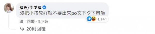 一名媽媽在臉書上發文抱怨孩子幼兒園同學家長,引發網友熱議,反質疑家長的觀念和教育,連鄉民女神「潔哥」李秉潔也留言反轟:「沒把小孩教好就不要出來po文『下夕下景(丟臉之意)』啦!」