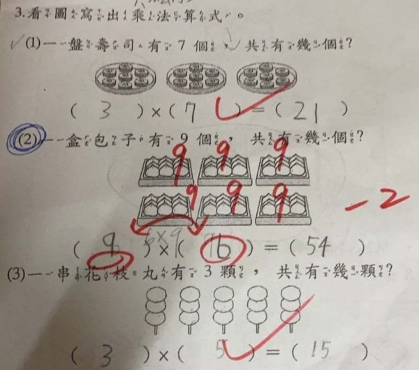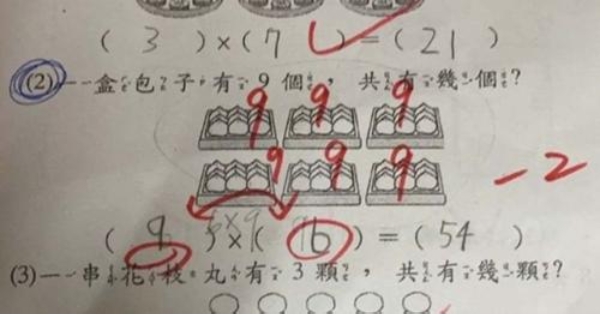 網友在「爆廢公社」貼出一道小二的數學題,題目要求學生「看圖寫出乘法算式」,其中一題內容為「一盒包子有9個,共有幾個?」。由圖片可見,一共有6盒包子,考生也在下方寫下「6×9=54」的算式,不料卻被老師用紅筆圈起來,還被扣了2分。